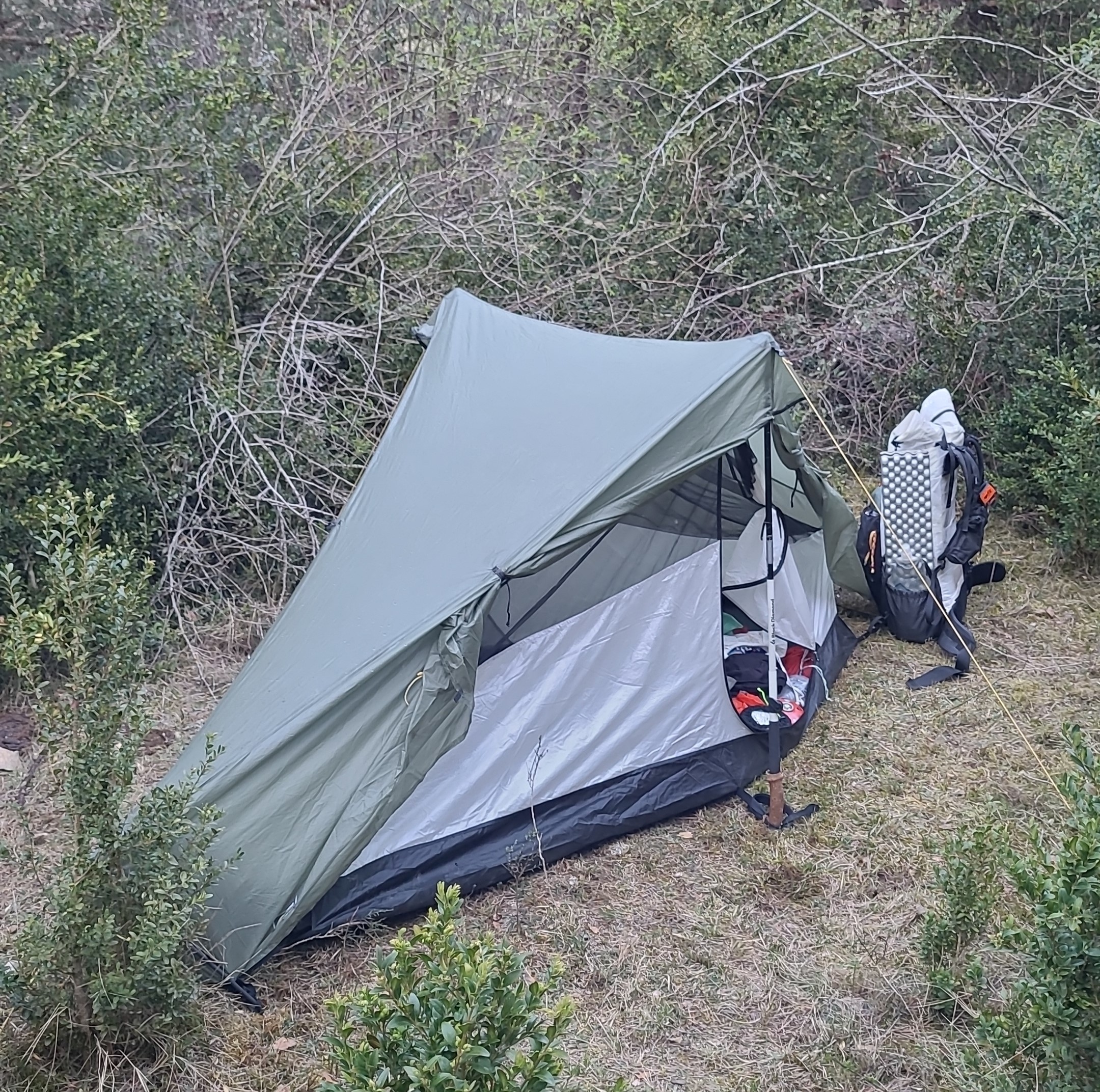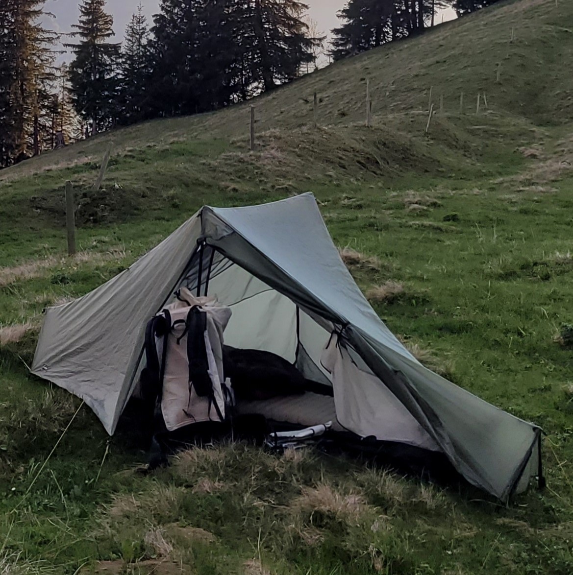 Ultralight-Zelte sind oft so designt, dass man sie mit den Wanderstöcken aufstellen kann. Da man diese ohnehin dabei hat, spart man sich das Zusatzgewicht der Zeltstange.