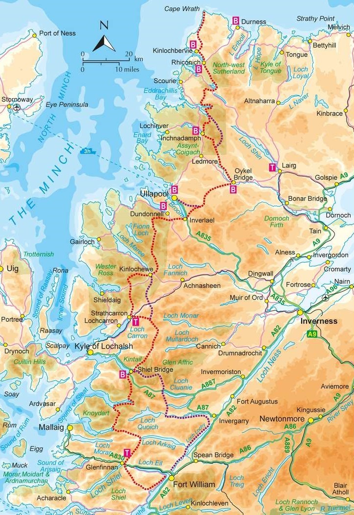 Der Cape Wrath Trail führt rund 400 km durch die westlichen Highlands. Im Prinzip kann man sich komplett selbst eine Tour zusammenstellen - es gibt keine markierten Routen und viel wegloses Gelände. Ich habe mich an die Route von Iain Harper (Walking the Cape Wrath Trail, Cicerone-Verlag) gehalten. Dank des guten Wetters konnte ich die anstrengenderen Alternativen machen.